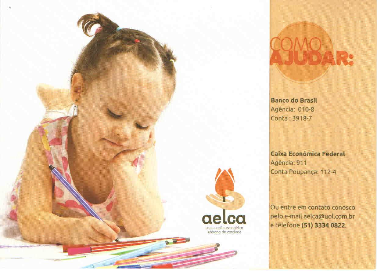 NOVO FOLDER AELCAComemoramos e compartilhamos com alegria que recebemos nosso novo folder, agora também com nosso novo Logo. O mesmo foi criado pela empresa Giornalle, que com a ajuda de apoio da Grafica Trindade, nos ofertou 2000 exemplares. Ele foi discutido e aprovado pela Diretoria da AELCA e agora apresentamos a todos por via virtual. Mas queremos entregar um destes a você. Por enquanto registramos nossa Gratidão a estes parceiros que nos honraram com esta importante parceria. Pedimos que Deus os acompanhe. Confiram as fotos do nosso folder enquanto ele não chega em sua casa.