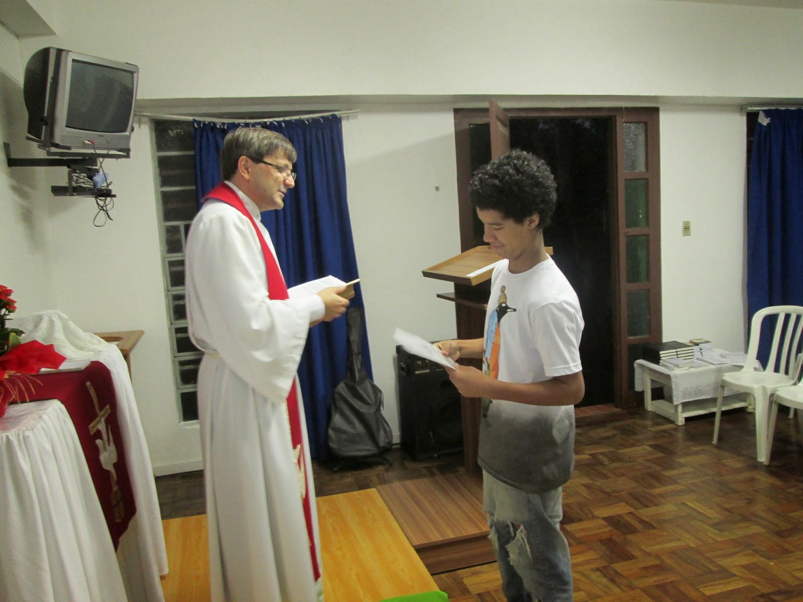 | Guilherme recebe Bíblia Pobreza e Justiça, utilizada no Culto de Confirmação como presente. |