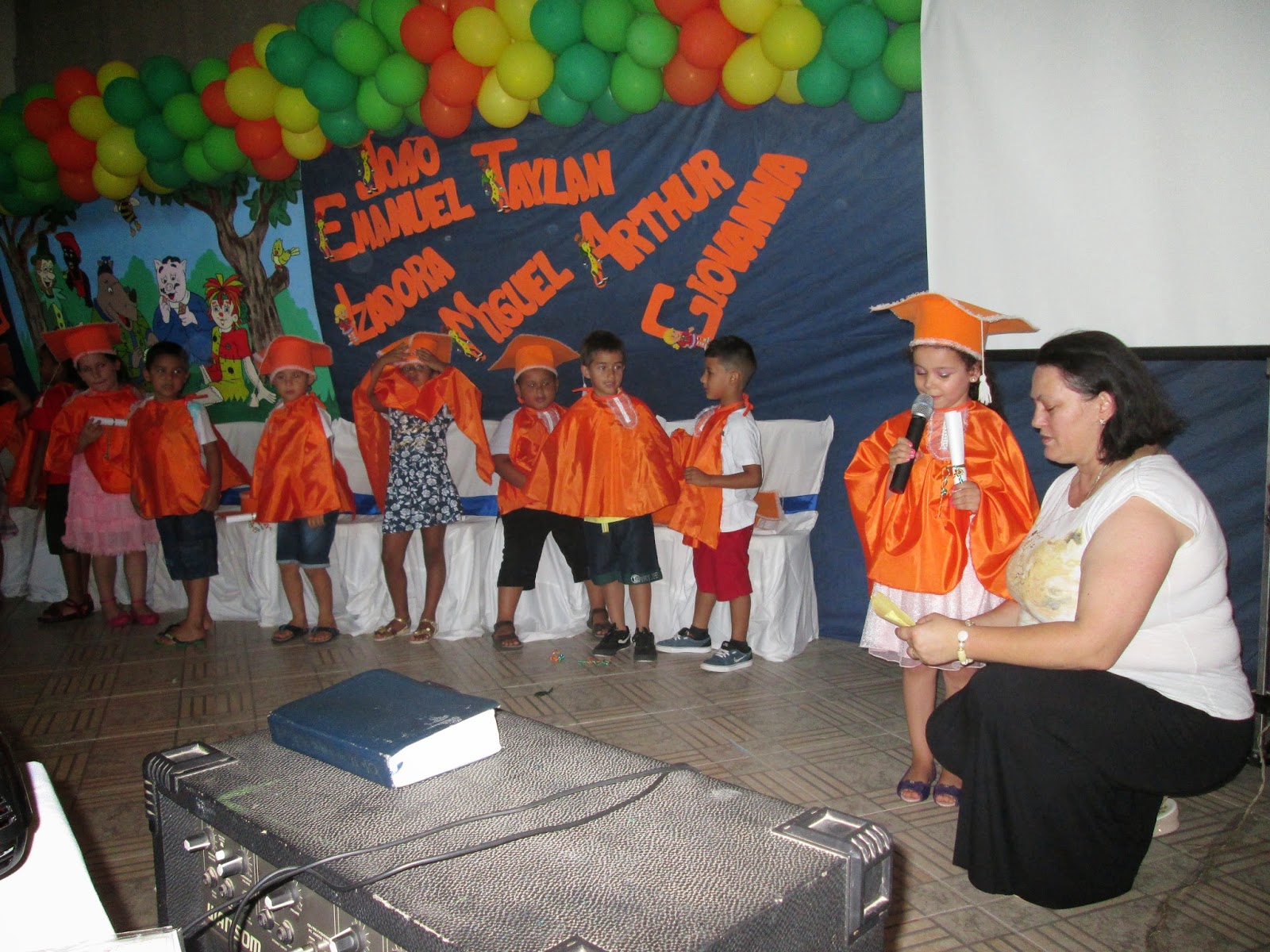 Aconteceu na sexta-feira(5/12) mais uma Formatura do nosso Jardim B. Estão prontos para o Primeiro Ano. Sob a orientação da professora Jovani, eles cresceram e se desenvolveram a ponto de chegarem a este momento. Tendo a Natasha como Madrinha, adentraram ao local da formatura. O Serviço de Convivência e Fortalecimento de Vínculos(SCFV), orientados pela Prof. Ilsa, se apresentou com a música “Te agradeço”. A Diretora, Professora da Turma, Madrinha e Pastor falaram aos presentes. Após o juramento a professora recebeu homenagens. O encontro finalizou com o tradicional lançar do chapéu por parte dos formandos.
