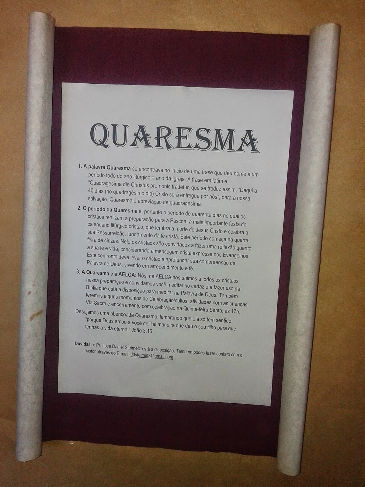 Nesta semana a AELCA marcou sua entrada no tempo de Quaresma. Preparou um cartaz que convida a acompanhar Jesus na sua caminhada até a Cruz. De lá percebemos todo o amor de Deus, quando Cristo intercede em favor dos pecadores. Esta é a mensagem que a AELCA quer deixar aos que chegam até ela. Deus em Cristo nos amou de tal maneira que enviou seu Filho para dar a sua vida em favor daquele que crê. Que esta Quaresma seja tempo de reflexão, arrependimento e fé, a luz da Palavra de Deus. Palavra distribuída através de livretos da Sociedade Bíblica do Brasil. Abençoada quaresma a todos.