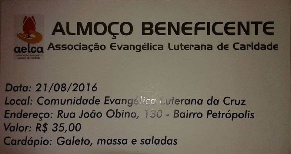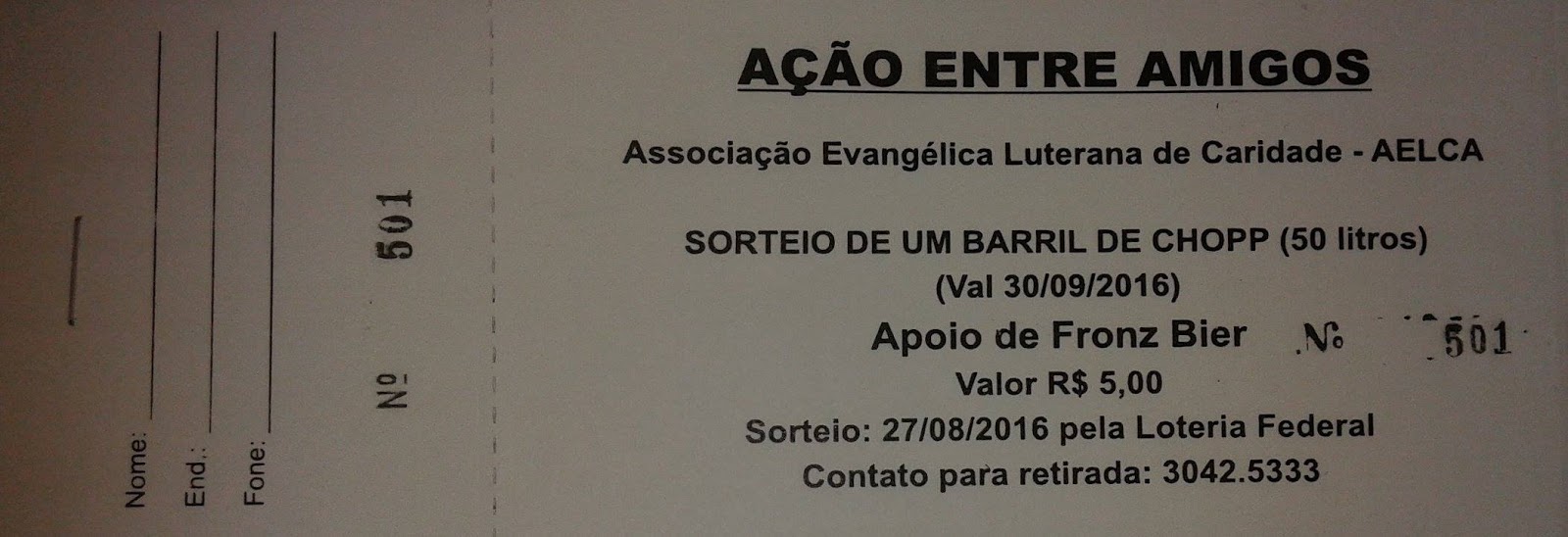 CONVIDAMOS todos a se engajarem nessa atividade em prol da AELCA, neste Almoço Beneficente, promovido pelo Sr Silvio Klein e amigos, com apoio de Fronz Bier. Portanto faça parte dessa atividade adquirindo seu cartão para o almoço e seu número para participar da Ação entre Amigos. Pode ser adquirido na recepção da AELCA.