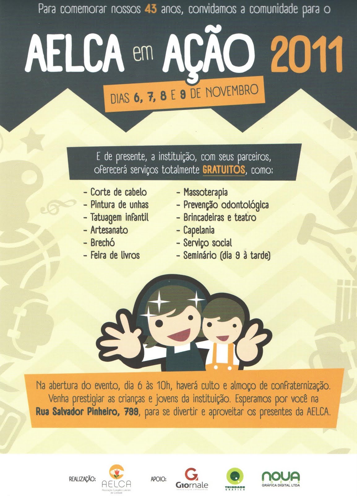 /0 Comentários/em Notícias /por aelcaEstamos comemorando o nosso 43º aniversário. Para celebrá-lo realizaremos várias atividades nos dias 6 a 9 de Novembro de 2011. Dia 6 teremos culto às 10hs, seguido de almoço às 12h.